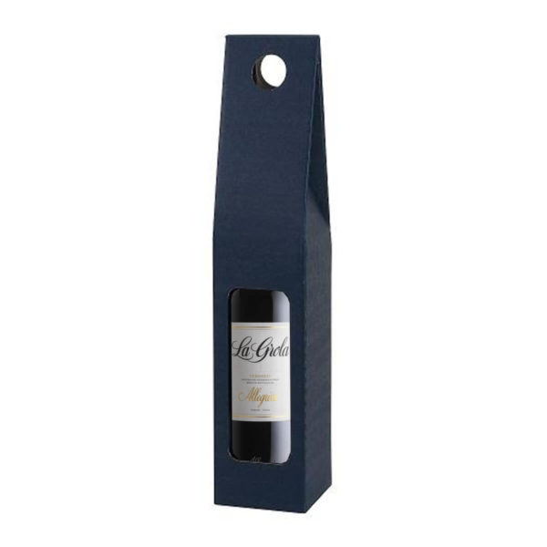 Darčekový obal na jednu fľašku vína 0,75 l z trojvrstvovej vlnitej lepenky – mikrovlna s uškom. Obal s okienkom umožňuje náhľad na etiketu fľaše.