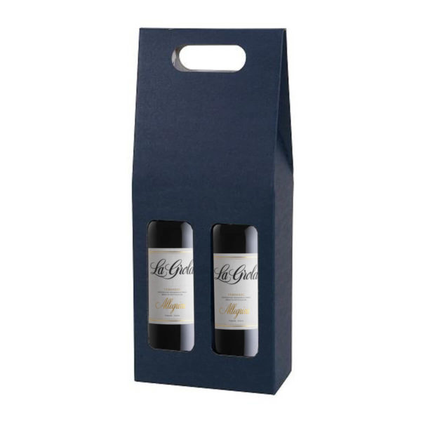 Darčekový obal na dve fľašky vína 0,75 l z trojvrstvovej vlnitej lepenky – mikrovlna s uškom. Obal s okienkom umožňuje náhľad na etiketu fľaše.