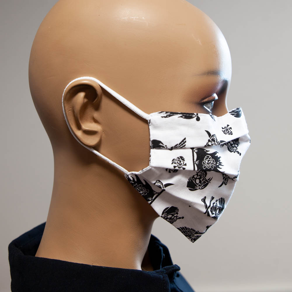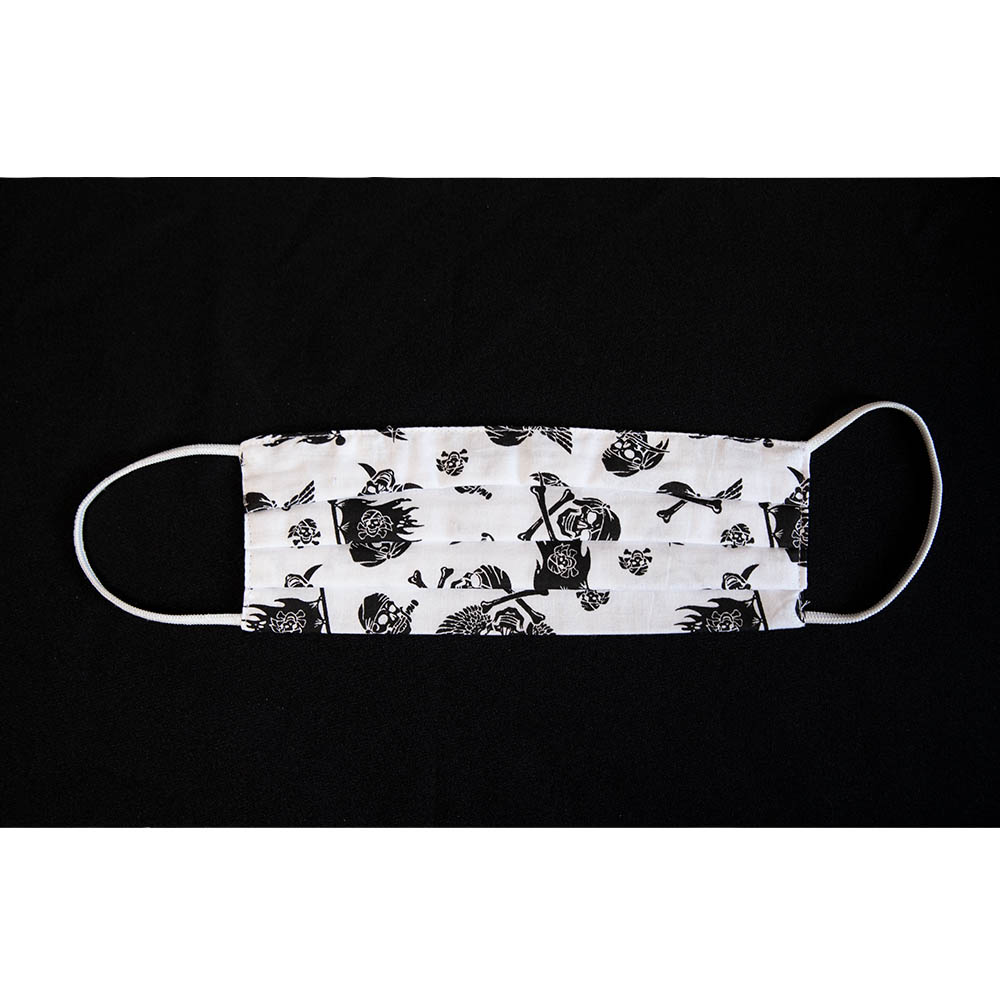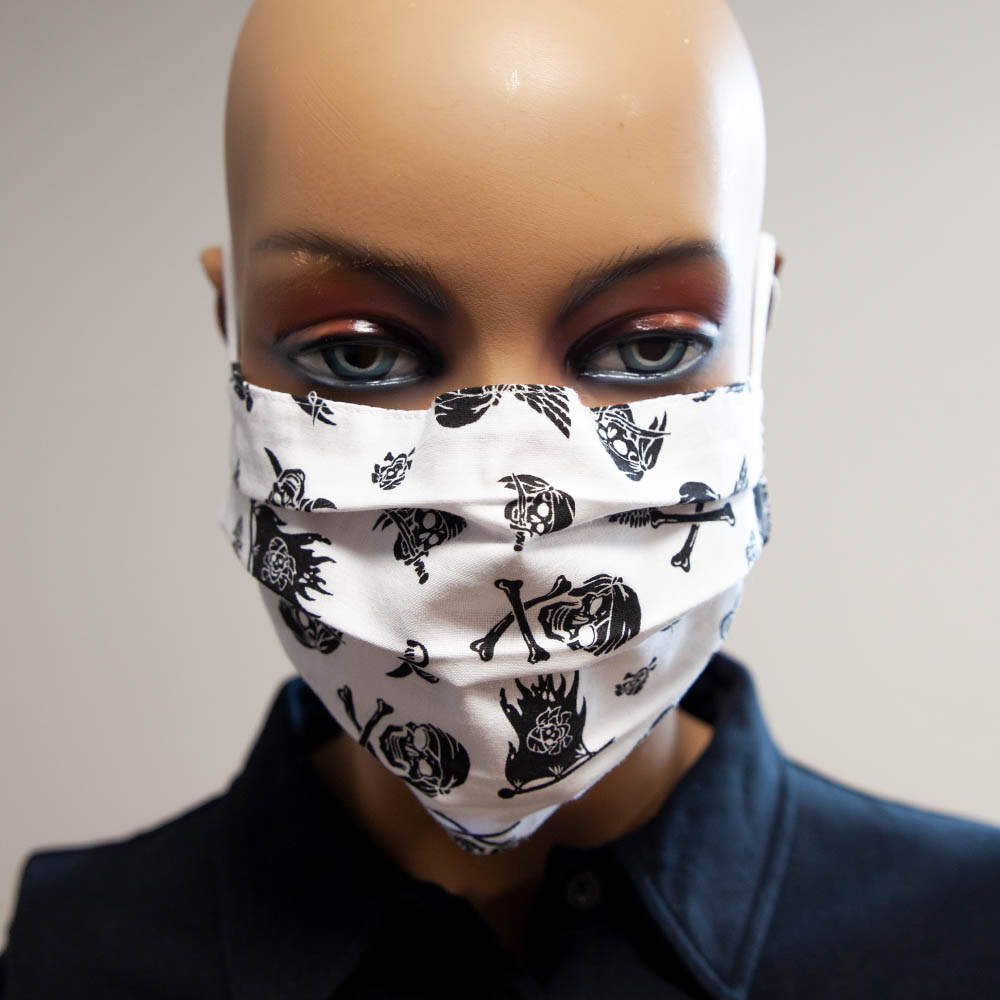 Vzorované bavlnené antibakteriálne rúško Lebka biele na tvár s gumičkou na praktické opakované použitie je vyrobené na Slovensku špecializovanou spoločnosťou v Bratislave.