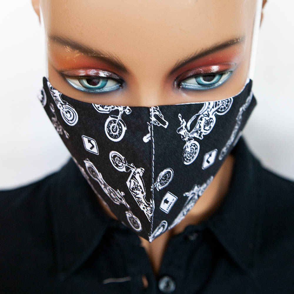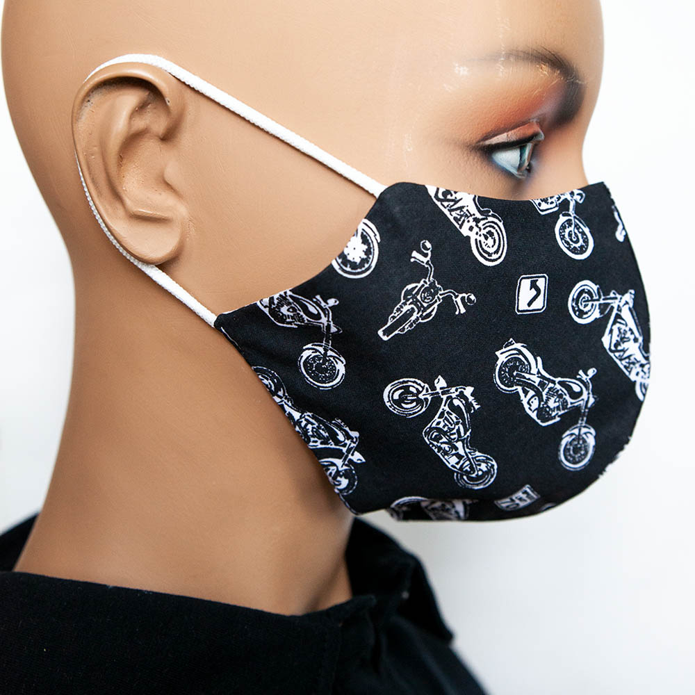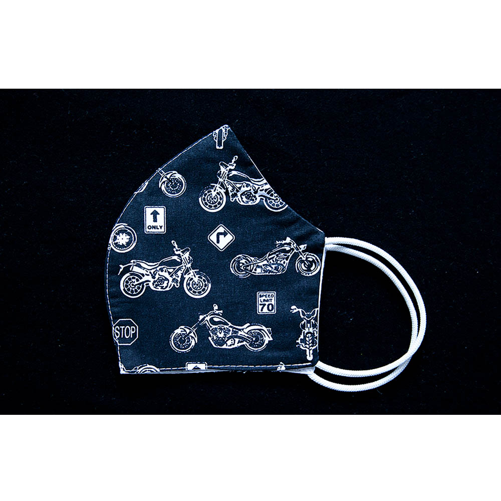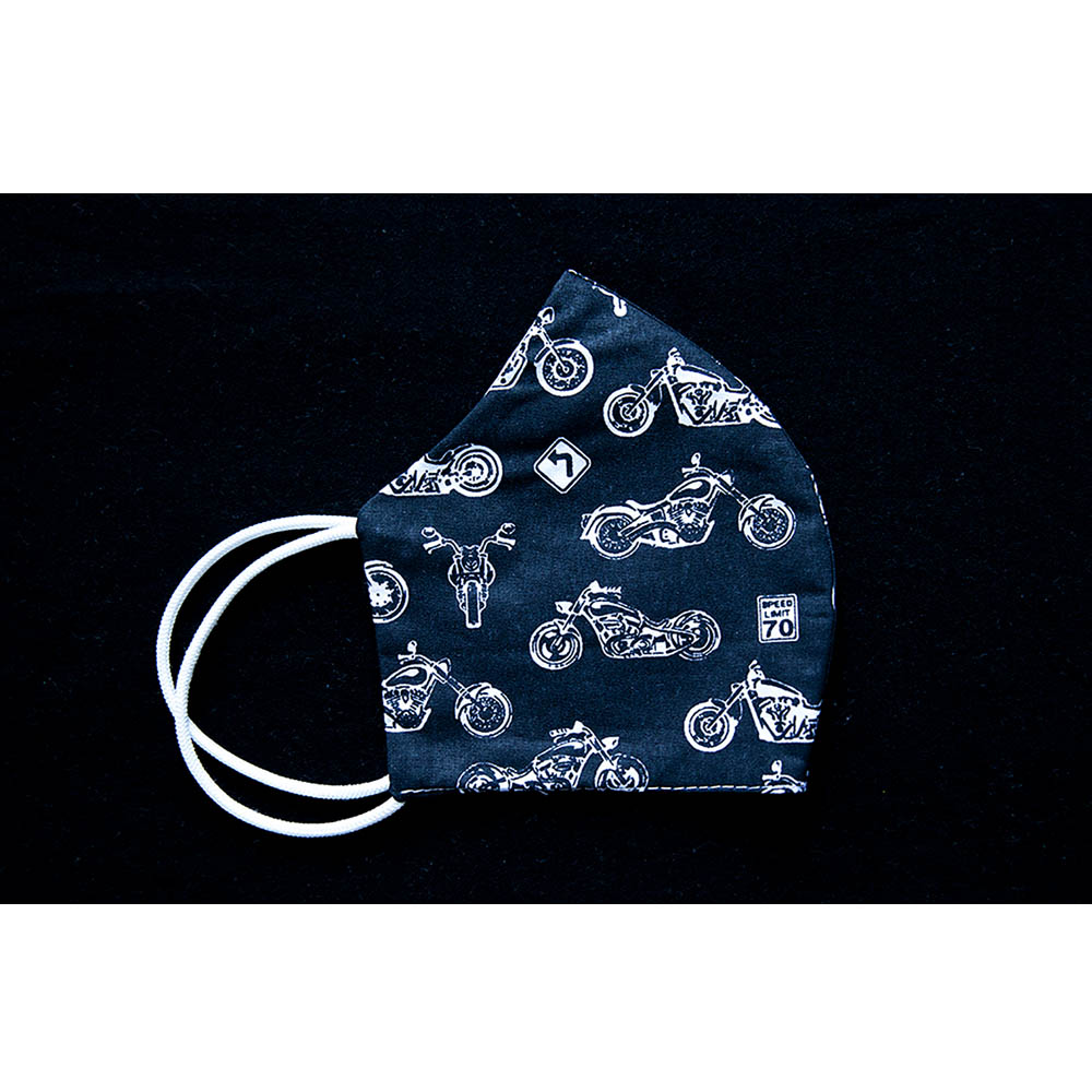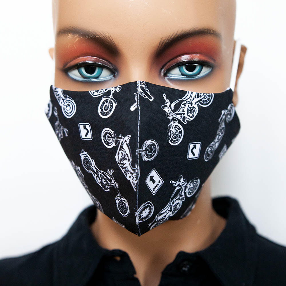 Vzorované bavlnené antibakteriálne rúško Motorky na tvár s gumičkou na praktické opakované použitie je vyrobené na Slovensku špecializovanou spoločnosťou v Bratislave.