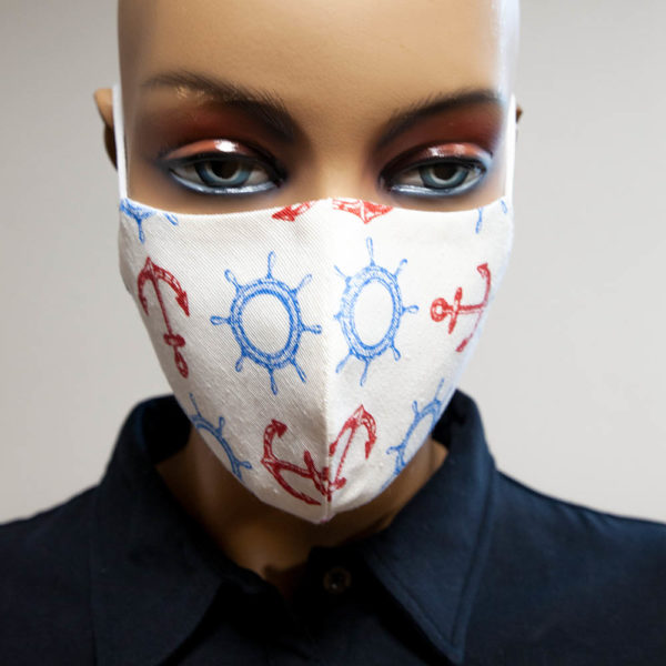 Vzorované bavlnené antibakteriálne rúško Námorník na tvár s gumičkou na praktické opakované použitie je vyrobené na Slovensku špecializovanou spoločnosťou v Bratislave.