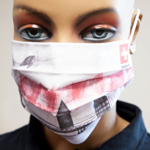 Ochranné rúška z limitovanej edície sú určené najmä na export do Švajčiarska. Grafika znázorňuje najstarší zastrešený drevený most…